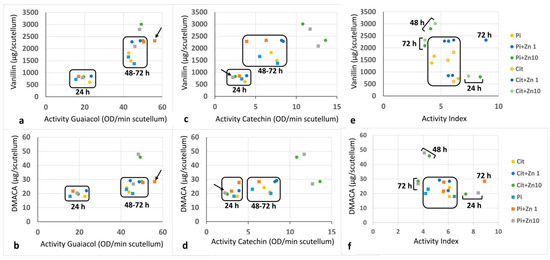 The relationship between the concentration of flavan-3-ol and the activity of POD-Cat or POD-Gua showed an association in which the values were grouped mostly into two groups, with some values being outside these groups (Figure 8). The first group corresponded to the determination at 24 h of imbibition, at which the lowest level of POD activity and concentration of phenols were recorded. The second group corresponded to the determinations at 48 and 72 h under most of the experimental conditions tested, at which time the highest POD activity levels and concentrations of flavonoids were recorded. Outside this grouping were the data corresponding to the POD-Gua vs. flavan-3-ol relationship in the presence of Pi+Zn10 or Cit+Zn10 at 48 h and Pi+Zn1 at 72 h (Figure 8a,b). For the ratio of POD-Cat vs. flavan-3-ol, the dispersed values were associated with Pi+Zn10 or Cir+Zn10 at 48 and 72 h of imbibition (Figure 8c,d). The relationship between AI and flavan-3-ol showed dispersion at 24, 48, and 72 h under Pi+Zn10 and Cit+Zn10 and at 72 h under Pi+Zn1 (Figure 8e,f).