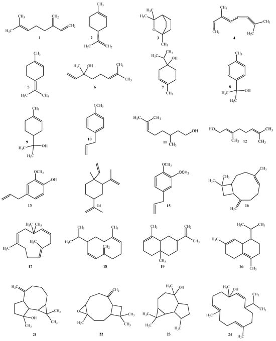 Continuous to our previous work on the effectiveness of PCEO, GC–MS analyses have been already carried out recently by our team and here we are only able to present the structure of the identified compounds, which will be used for biological activities and the molecular docking study [24]. The chemical structures of the twenty-four compounds identified in the essential oil tested using the GC–MS technique are listed in Figure 1.