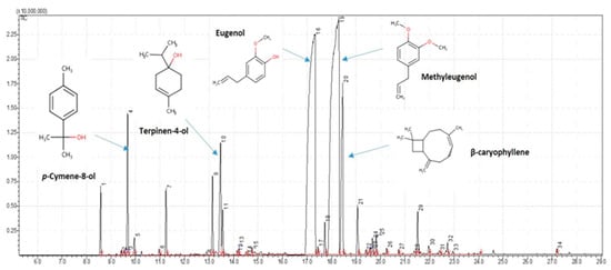 Chromatogram showing the main identified compounds in Piper cubeba essential oil (PCEO): methyleugenol (41.31%), eugenol (33.95%), β-caryophyllene (5.65%), p-cymene-8-ol (3.50%) and 1,8-cineole (2.94%).