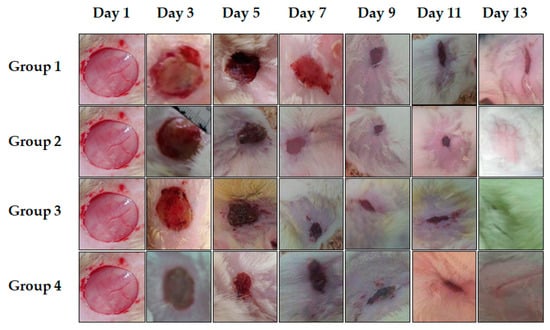 The evaluation of the wound healing effect was carried out on rats weighing 189.19 ± 12.35 g. These rats were divided into four groups of 4 rats each: