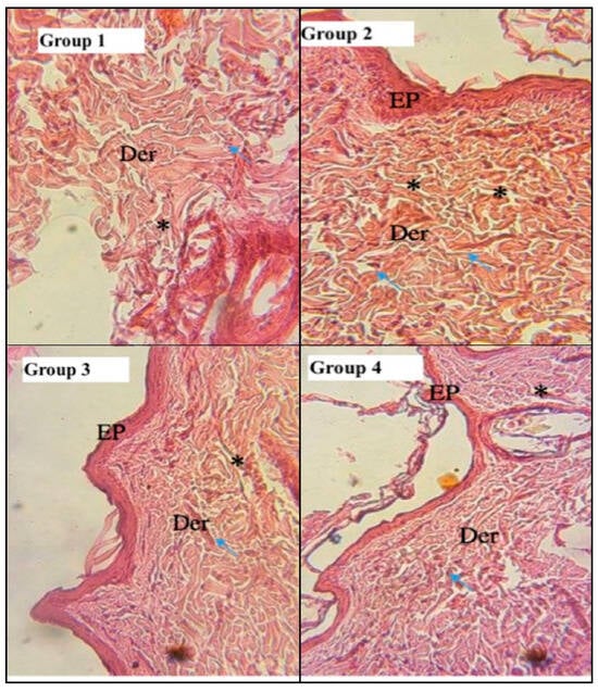 Photomicrographs of histological sections of cutaneous scars mechanical wounds (40) at day 13 of treatment (hematoxyline–osin staining). EP: epidermis, Der: dermis, (↑): inflammatory cells, (*): blood vessels.