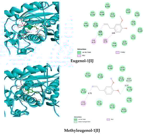 Methyleugenol-TyrRS (1JIJ) interactions: The first PCEO major compound methyleugenol (−5.8 kcal/mol) established several van der Waals interactions with the following TyrRS residues named Gly38, Asp40, Leu70, Thr75, Asp80, Asn124, Tyr170, Gln174, Gly 192, Gly193 and Gln196, one H-bond interaction with Asp177 (3.77), one C-H bond interaction with Pro45 (3.45) and also one alkyl interaction with Cys37 (4.75).