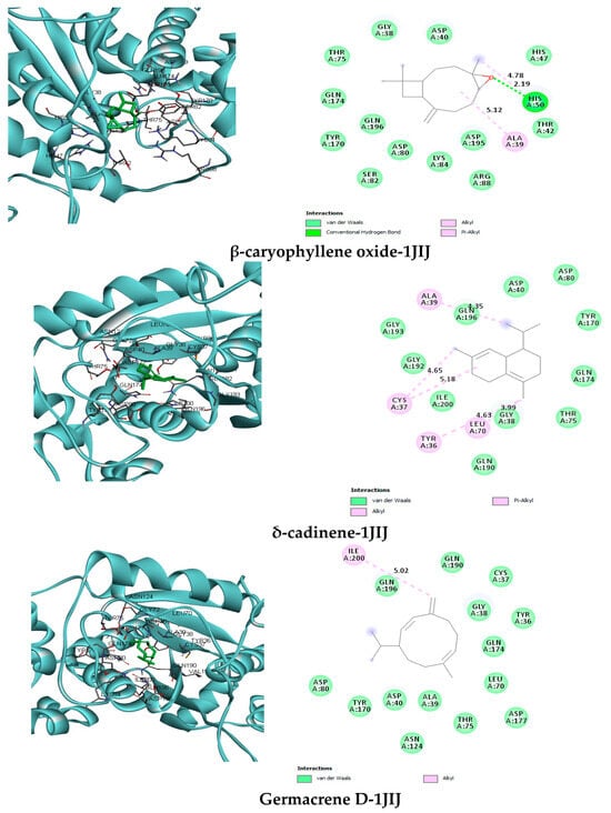 δ-cadinene-TyrRS (1JIJ) interactions: δ-cadinene (−7.1 kcal/mol) formed van der Waals interaction with Gly38, Asp40, Asp80, Tyr170, Gln174, Thr75, Gln190, Gly192, Gly193, Gln196 and Ile200 and Alkyl/Pi-Alkyl interactions with Tyr36 (4.63), Cys37 (4.65), Ala39 (4.35) and Leu70 (3.99) (5.18), respectively.