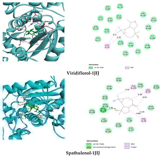 Spathulenol-TyrRS (1JIJ) interactions: Spathulenol (−6.6 kcal/mol) was able to build van der Waals interactions with Cys37, Ala39, Gly38, Asp40, Thr75, Asp80, Asn124, Asp177, Gln190, Gly 192, Gln196, Asn199 and Ile200, C-H bond interactions with Gln174 (1.81) and Alkyl/Pi-Alkyl interactions with Tyr36 (4.88) (5.35), Leu70 (4.24) (5.28) and Tyr 170 (5.31).