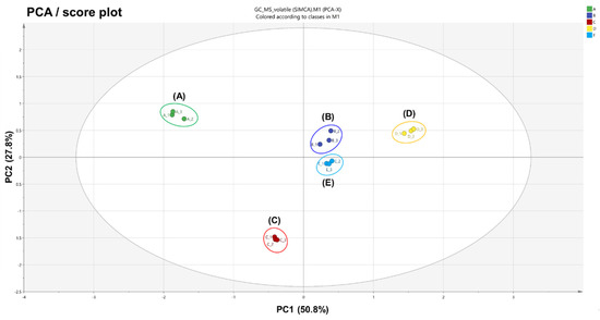 Principal component analysis (PCA) score plot obtained from HS-SPME-GC-MS results on five variants of Abeliophyllum distichum flowers: (A) white miseon, (B) pink miseon, (C) ivory miseon, (D) blue miseon, (E) round miseon.