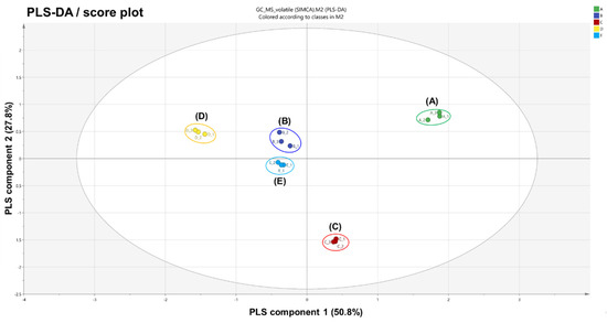 Partial least squares discriminant analysis (PLS-DA) score plot obtained from HS-SPME-GC-MS results on five variants of Abeliophyllum distichum flowers: (A) white miseon, (B) pink miseon, (C) ivory miseon, (D) blue miseon, (E) round miseon.