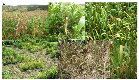 Figure 1. (A) East African smallholder maize crop devastated by maize lethal necrosis disease (all maize plants killed or dying); potato understory crop unaffected. (B) Maize plant dying from maize lethal necrosis disease (center), surrounding maize plants healthy, image modified from [9]. (C) Wheat crop containing yellow dwarf diseased plants showing flag leaf symptoms of reddening and chlorosis. (D) Rows of wheat plants showing severe yellow dwarf disease symptoms of leaf chlorosis and reddening and plant stunting. (E) Wheat crop devastated by wheat streak mosaic disease showing plants with severe leaf chlorosis, deformation and necrosis, and overall plant stunting. (F) Close up of wheat plant showing wheat streak mosaic disease leaf symptoms of chlorotic yellowing and green streaking.