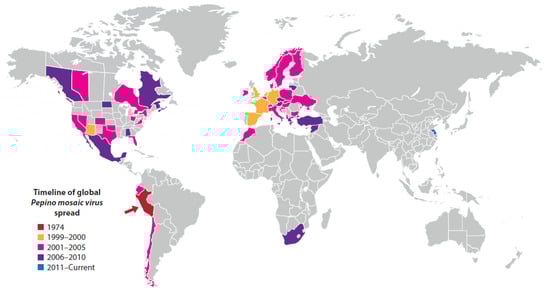 South and North America, Europe, Middle East, Africa (Morocco, South Africa), East Asia (China) Pepino mosaic virus PotexvirusContact transmission and by bee pollinators Tomato (Solanum lycopersicum)Andean region of South America Unmarketable fruit cause major losses. Probably coevolved with, pepino, pepper and semi-domesticated tomato in the Andean region of South AmericaAncestral virus spread by contact from wild tomato to pepino, pepper and tomato crops in the Andean region Infects pepper and pepino crops, wild tomato species; and 18 weed species from seven different non-Solanaceae families in SpainSeed-borne international spread in contaminated tomato seed, and to a lesser extent in infected seedlings and fruit. Spread favored by intensive protected cropping procedures[7,72,124,125,126,127,128,129]