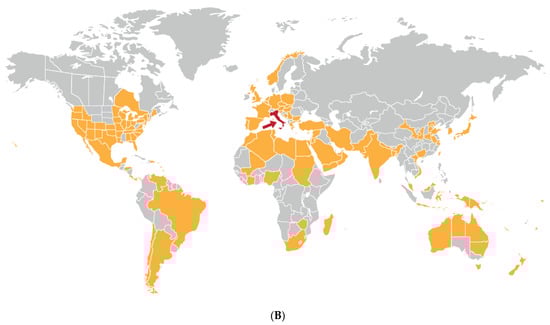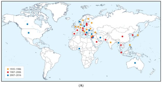 Figure 5. (A) Global spread of cucumber green mottle mosaic virus after its first detection in England in 1935. Colored circles show first detections within individual countries over three eras: yellow = 1935–1985; red = 1986–2006; blue = 2007–2016. This virus is readily seed-borne and was disseminated between continents, and across regions and countries, inadvertently, by the international cucurbit seed trade (figure credit @Volcani Center/Aviv Drombovsky). Figure modified from [39]. (B) Global spread of zucchini yellow mosaic virus after its first detection in Italy in 1973 (red arrow). During the following decade, it appeared in all continents with tropical, subtropical, Mediterranean, and temperate climates. It is seed-borne and was inadvertently disseminated between continents, and across regions and countries. This dissemination occurred mostly by the international cucurbit seed trade, but less often by infective aphid vectors blown in wind currents or international trade in infected fruit. The figure shows countries, and in some instances states within countries, reporting infection up to 2018 (figure credit @Washington State University/Naidu Rayapati). Figure from Supplementary data in [9].