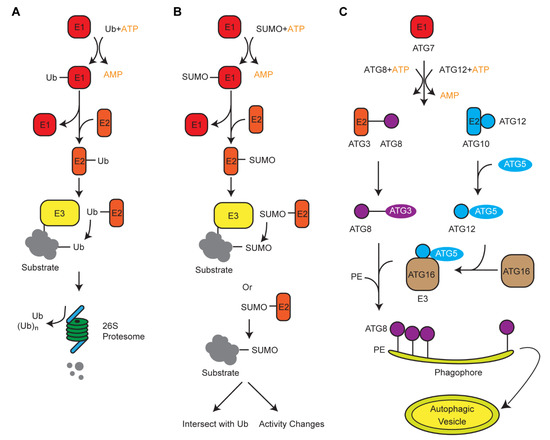 Schematic diagrams showing the ligation process of ubiquitin (Ub), small ubiquitin like-modifier (SUMO), and autophagy-related protein 8 (ATG8). (A,B) The ubiquitylation and SUMOylation processes use a similar cascade reaction to add Ub or SUMO moieties, respectively, on to a target protein. However, different E1, E2, and E3 enzymes are involved. Ubiquitylation utilizes a much larger set of E3 enzymes to target a diverse group of substrates. SUMOylation can also occur in the absence of E3. (C) Autophagy formation is mediated by a variety of ATG proteins that are similar to E1, E2, and E3 that act sequentially. Activation of ATG8 and ATG12 require an ATP-dependent ATG7. ATG8 and ATG12 then conjugate with ATG3 and ATG5, respectively. With the help of an E3 ligase ATG5–ATG12/16 complex, ATG8 conjugates with phosphatidylethanolamine to form a double-membrane autophagic vesicle, i.e., autophagosome, in which substrates are engulfed either non-selectively or selectively through interacting with ATG8.
