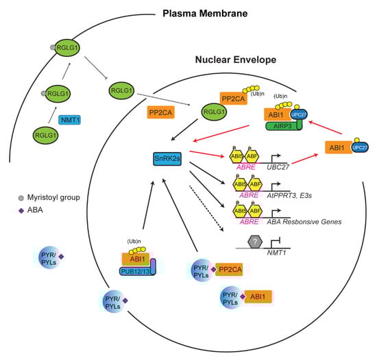 Ubiquitin-26S proteasome system (UPS)-mediated turnover of PP2CA promotes abscisic acid (ABA) signaling. PP2CA proteins including ABA insensitive 1 (ABI1) are ABA co-receptors that negatively regulate ABA response by inhibiting the phosphorylation activity of sucrose non-fermenting-1 (SNF1)-related protein kinases (SnRK2s). SnRK2s activities are activated either through its dissociation with PP2CAs that are competed out by ABA receptors, pyrabactin resistance (PYR)/PYR1-like (PYL), upon ABA perception or by UPS-mediated degradation of PP2CAs. Ubiquitylation of PP2CAs by really interesting new gene (RING) domain ligase 1 (RGLG1), ABA-insensitive RING protein 3 (AIRP3), and plant U-box (PUB)12/13 results in their degradation in the 26S proteasome, thus freeing SnRK2 proteins to activate ABI5 and ABF bZIP transcription factors. Expression upregulation of E2 (e.g., Ub conjugating enzyme 27 (UBC27)) and E3 ligases (e.g., AtPPRT3) and inhibition of N-myristoyltransferase 1 (NMT1) reinforce the turnover process of PP2CAs, thus promoting ABA signaling. Red lines highlight the reinforcement intersection between ABA signaling and UBC27–AIRP3-mediated ABI1 degradation. The latter process could happen in both cytoplasm and nucleus.