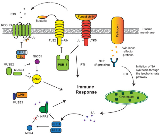 Genetic screens have uncovered multiple redundant SNC1-like receptors that play similar roles and are under the same negative regulation as SNC1 [82]. These receptors, named sidekick SNC1 1 (SIKIC1), associate with SNC1 to regulate its function. To suppress autoimmunity, SIKIC1 is under the control of two RING E3 ligases—MUSE1 and 2 [82]. It is yet unclear as to the mechanisms that are undergone to activate SNC1; however, what is clear is that there is an extensive network of regulatory E3 ligases that act to repress constitutive immune response.