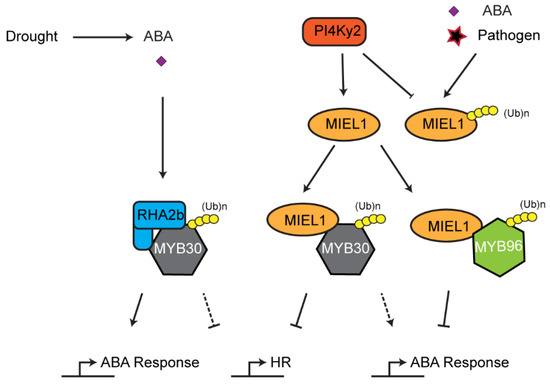 The UPS also influences plant HR. As discussed above, chloroplasts, such as mitochondria, are plant organelles that play important roles in generating ROS, which can lead to HR-like cell death mediated by a mitogen activated kinase cascade [160]. The role of UPS in regulating chloroplast ROS homeostasis implies a possibility of UPS-mediated HR. In addition, the UPS also directly regulates the stability of transcription factors involved in HR. One pathway is exemplified by MYB domain protein 30 (MYB30)-mediated HR pathogen defense (Figure 6). MYB30 is a transcription factor that activates expression of genes associated with stress including those involved in very long fatty acid biosynthesis [161,162]. During standard growth conditions, MYB30 is expressed and marked for degradation by a RING E3 ligase MYB30-interacting E3 ligase1 (MIEL1) to prevent constitutive activation of HR [90]. It was discovered that MIEL1 itself is also subjected to degradation in a UPS-dependent manner, likely through autoubiquitylation, which is prevented by the interaction of phosphatidylinositol 4-kinase γ2 (PI4Kγ2). Dissociation between PI4Kγ2 and MIEL1 promotes MIEL1 autoubiquitylation and turnover. As a consequence, MYB30 is stabilized to activate HR reactions [163]. However, how PI4Kγ2 is prevented from interacting with MIEL1 remains further investigation. One possibility could involve ABA signaling [164]. Interestingly, MIEL1 also targets the degradation of MYB96, a transcription regulator of ABA signaling [164]. The research found that both ABA treatment and pathogen infection enhanced accumulation of MYB96 and expression of MYB30-responsive genes by promoting MIEL1 turnover, suggesting that MIEL1 bridges the interplay between ABA and biotic stress signaling [164]. In addition to MIEL1, a RING E3 ligase, RING-H2 finger protein 2B (RHA2b), also interacts and degrades MYB30 in an ABA-dependent manner during drought response [97]. Whether RHA2b, like MIEL1, regulates plant HR is yet unknown.