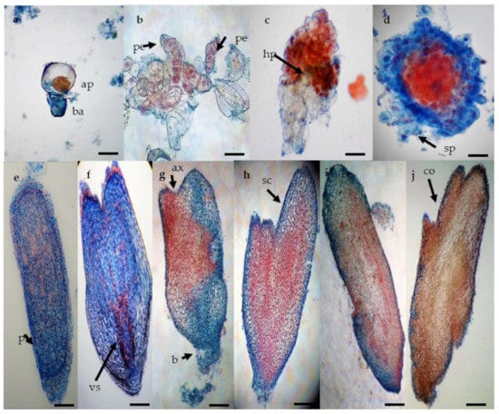 The staining used in the present study characterized embryogenic calli by discriminating small dividing cells with a higher proportion of nucleic acids (stained with acetocarmine due to their affinity to this pigment) from those large and vacuolated (stained with Evan’s blue due to the basic pH). The unicellular origin of the SEs is indicated by an initial asymmetrical cell division (Figure 2a). Pre-embryogenic cells showed properties that are common to cells in the division stage with high metabolic activity (Figure 2b). A suspensor type structure independent of the embryogenic callus could be observed in the next stage (Figure 2c,d). At this stage, we also observed a potential hypophysis like structure, which is a prominent cell zone (cells in contact with the embryo that link it to the suspensor) that promotes the formation of the radicle (Figure 2c). At the globular stage, the delimiting protoderm between the callus and the somatic embryo marked the independence of the embryo (Figure 2e). Then, differentiated pro-vascular strands were observed in scutellar embryos (Figure 2f). At the scutellar stage (Figure 2g,h), the apical axis or plumule (shoot) and basal axis that gives rise to radicle (root) differentiation (Figure 2j). The coleoptilar stage (Figure 2i,j) is characterized by the histodifferentiation of coleoptiles as the last major morphogenic transition of the embryos.