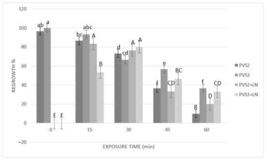 Effect of exposure length to plant vitrification solutions (PVS) PVS2 or PVS3 at 0 °C on regrowth of somatic embryos (SEs) before and after cryopreservation. SEs were precultured on MS solid medium with 0.3 M sucrose in the dark for one day, encapsulated over the cryoplate with calcium alginate (2%) containing 0.4 M sucrose, and loaded with 1 M sucrose + 2 M glycerol for 15 min before exposure to PVS. Data are represented by means (%) ± standard error (se). Bars with the same letter are not significantly different p ≤ 0.05 (LSD test). Lowercase letters refer to non-cryopreserved controls, and uppercase letters refer to cryopreserved plus liquid nitrogen (+LN) samples. Regrowth was detected as the percentage of SEs that showed elongation of coleoptile and the formation of radicle 45 days after their transfer to the culture medium.