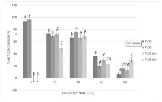 Effect of exposure length to PVS2 or PVS3 at 0 °C on the conversion of somatic embryos (SEs) to plants before and after cryopreservation. SEs were precultured on MS solid medium with 0.3 M sucrose in the dark for one day, encapsulated over the cryoplate with calcium alginate (2%) containing 0.4 M sucrose, and loaded with 1 M sucrose + 2 M glycerol for 15 min before exposure to PVS solution. Data are represented by means (%) ± standard error (se). Bars with the same letter are not significantly different p ≤ 0.05 (LSD test). Lowercase letters refer to non-cryopreserved controls, and uppercase letters refer to cryopreserved (+LN) samples. Conversion to plants of cryopreserved SEs was evaluated after 105 days of culturing on MS medium.