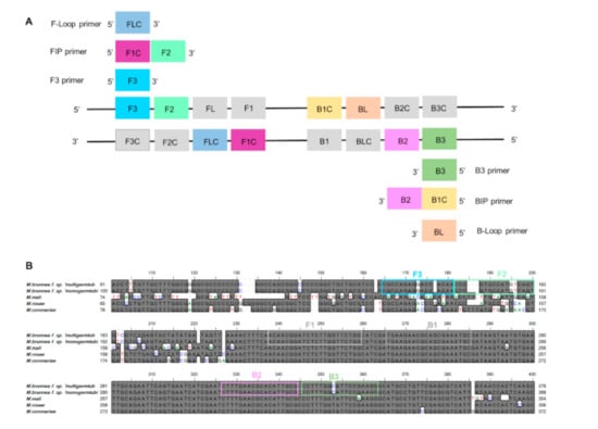 A successful LAMP reaction with species-specific primers produced many bands of different sizes in a reproducible ladder-like pattern. When the sample tube did not contain selected target DNA or any of the primers F3 (forward outer primer), B3 (backward outer primer), FIP (forward inner primer), and BIP (backward inner primer), no amplification was observed.