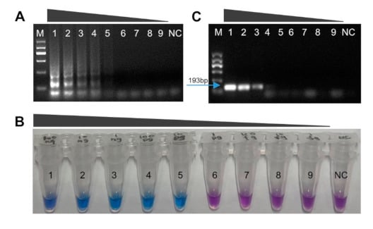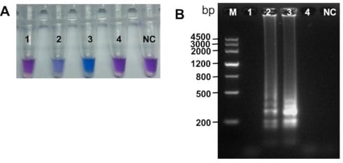 The simplicity of LAMP could also be described in the result visualization. Two formats in this study to judge the reaction results include visual inspection with HNB dye and agarose gel electrophoresis. The common intercalating dyes including calcein, SYBR green I, and HNB [24,28,48], as well as several other existing dyes, such as malachite green [49], Picogreen [50], Gelred [51], SYTO fluorescent [52], Evagreen [53], Goldview II [54], and berberine [55], were added into the reaction tube for visualization LAMP products. Positive reaction tube will exhibit color change or fluorescence, while for negative controls, this will not occur. Thus, unlike PCR, tedious procedure of gel electrophoresis is not needed. However, adding the dyes often requires the opening of the reaction tubes, therefore increasing the risk of carry-over contamination [56]. To avoid such contamination, we selected HNB dye as a visual indicator that we added to the LAMP reaction tube prior to amplification in our study. A positive reaction was indicated by a color change from violet to sky blue Figure 2A, Figure 3B, Figure 4B, Figure 5B, and Figure 6B). Moreover, it has been reported that the SYBR green I dye could inhibit LAMP reaction if the dye is added before isothermal incubation [57]. The pre-addition of 192 μM HNB into the LAMP reaction mixture enabled real-time monitoring with no inhibitory effect. Meanwhile, the results of the visual detection with HNB in this study were further verified by 2% agarose gel electrophoresis, as the result of positive tube after amplification will display a ladder-like pattern. The results obtained are perfectly in accordance with that of the visual detection with HNB Figure 2, Figure 3A,B, Figure 4A,B, Figure 5A,B, and Figure 6A,B).