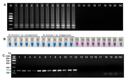 To determine the sensitivity of the LAMP assay, we performed reactions using 10-fold serial dilutions of a 100 ng/μL genomic DNA solution (M. brunnea strain XY-3) down to 1 fg/μL. The results are shown in Figure 4A,B, in which the DNA concentrations decreased from left to right. The minimum concentration detected was 10 pg/μL in the LAMP assay (Figure 4A,B). PCRs were performed using the same DNA samples. PCR amplification products of 193 bp were observed in samples ranging from 100 ng/μL to 1 ng/μL (Figure 4C). Negative control showed no amplification under the same conditions (Figure 4A–C). The LAMP and PCR assays were carried out in triplicate for each template DNA. The results suggest that the LAMP assay (10 pg/μL) has a 100-fold greater sensitivity as compared with conventional PCR (1 ng/μL).