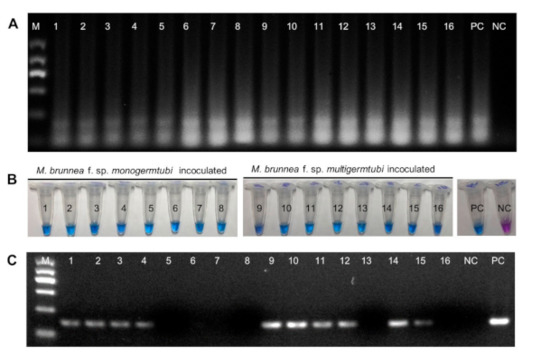 Detection of M. brunnea from artificially infected poplar leave samples by the LAMP and PCR assays. (A) Detection M. brunnea in artificial infected poplar leaves by LAMP assay conducted on the basis of the appearance of a ladder-like pattern. Negative reactions did not show any ladder-like patterns. (B) Detection M. brunnea in artificial infected poplar leaves by LAMP assay conducted on the basis of color change. PC = positive control and NC = negative control. The positive reactions (infected leaves) showed a color change to sky blue while negative amplification reactions remained violet in color. (C) Detection M. brunnea in artificial infected poplar leaves by PCR assay. PC = positive control [purified genomic DNA (gDNA) of M. brunnea strain XY-3]; NC = negative control (purified gDNA from M. brunnea-free poplar leaves spray-inoculated with deionized water liquid). Lanes and tubes 1–8 are purified gDNA from poplar leaves infected by M. brunnea f. sp. monogermtubi strain QC2; lanes and tubes 9–16 are purified gDNA from poplar leaves infected by M. brunnea f. sp. multigermtubi strain 214-4; M = molecular size ladder.