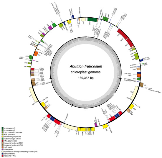 Gene map of the A. fruticosum chloroplast genome. Genes outside the circles are transcribed in the counter-clockwise direction and those inside in the clockwise direction. Known functional genes are indicated by colored bar. The GC and AT contents are denoted by the dark gray and light gray colors in the inner circle, respectively. LSC indicates large single copy; SSC indicates small single copy; and IR indicates inverted repeat.