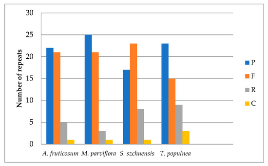 Number of different repeats in chloroplast genomes of five species of Malvaceae. P = palindromic, F = forward, R = reverse and C = complement.