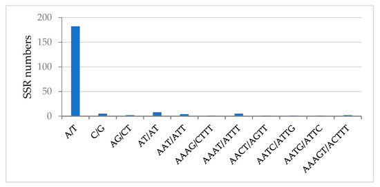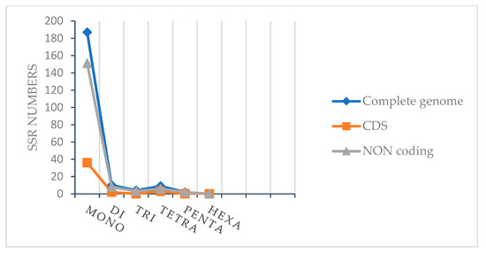 There were short repeats of nucleotide series (1–6 bp) that were dispersed through the whole genome called microsatellites (SSRs). These short repeats in the plastid genome were passed from a single parent. As a result, they are used as molecular indicators in developmental studies such as genetic diversity and also contribute to the recognition of species [44,45,46]. A total of 212 microsatellites were found in the chloroplast genome of A. fruticosum in this study (Table 7). The majority of SSRs in the cp genome are mononucleotides (88.88), where poly-A (polyadenine) and poly-T (polythymine) are dominant (Figure 4). Poly-A constituted 45.06%, whereas poly-T constituted 41.97%. This is consistent with previous studies [47]. Among the dinucleotide repeats, only AG/CT and AT/AT were found in the cp genome. Taking into account the complementarity of series, only one trinucleotide (AAT/ATT), five tetranucleotides (AAAG/CTTT, AAAT/ATTT, AACT/AGTT, AATC/ATTG and AATG/ATTC) and only one pentanucleotide (AAAGT/ACTTT) were present in the cp genome (Figure 4). The intergenic/non-coding regions harbored most of the microsatellites (75.92%) (Figure 5).