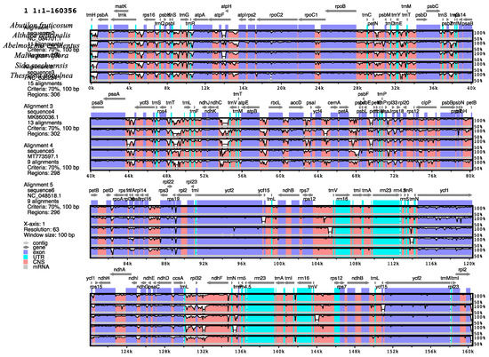 To examine the degree of divergence in the chloroplast genome of the six species of Malvaceae, comparative analysis was conducted using the mVISTA program to align the sequences using the annotation of A. fruticosum as a reference. The alignment showed that the genomes are highly conserved with some degree of variation. The coding regions are more conserved than the non-coding regions and the inverted repeat regions are more conserved than the single copy regions (Figure 7). This was reported in the chloroplast genomes of some genera in previous studies [47,48]. The most divergent non-coding regions among the six cp genomes are trnH-psbA, trnK-rps16, psbI-trnS, atpH-atpI, trnT-trnL, ndhC-trnV, accD-psaI, petA-psbJ, atpB-rbcL, rps12 and trnL-rpl32. A slightly lower level of variability was observed in the following genes: matK, ycf1, ndhH, ycf2 and accD. These regions can be used as a source of potential barcodes for identification/authentication of Malvaceae species as well as resources for inferring phylogenetic relationships of the family.