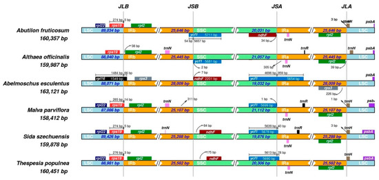 Comparison of the borders of the IR, SSC and LSC regions among six chloroplast genomes of Malvaceae (JLB: juction of LSC and IRB; JSB: junction of SSC and IRB; JSA: juction SSC and IRA; JLA: junction LSC and IRA).