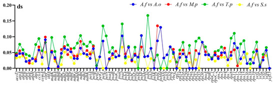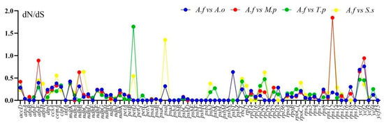 The synonymous (dS) and nonsynonymous (dN)/dS ratio values of 80 protein-coding genes from five Malvaceae cp genomes (A.f: A. fruticosum; A.o: A. officinalis; M.P: M. parviflora; T.p: T. populnea; S.s: S. szechuensis).