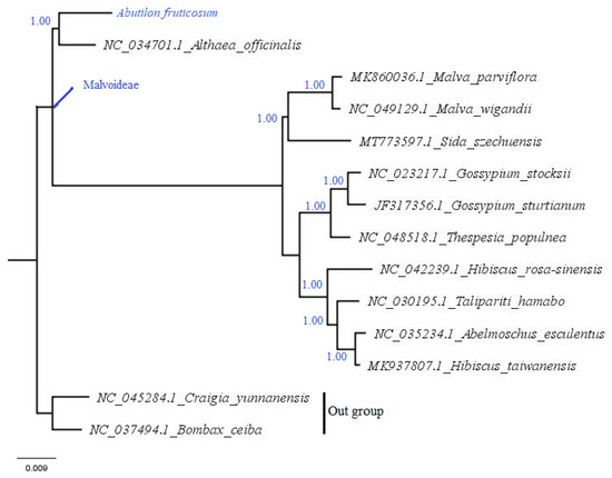 Phylogenetic tree reconstruction of 14 taxa based on the complete chloroplast genomes using the Bayesian inference (BI) method showing relationships within the 14 species of Malvaceae. The numbers in the branch nodes represent posterior probability (PP).