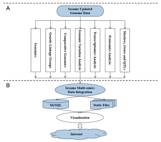 Framework for data integration and database implementation. (A) Data integration for sesame multi-omics data including the data of genomics; transcriptomics; proteomics; and functional markers, genes and QTLs. (B) Implementation of Sinbase 2.0 including data integration, data storage and visualization.