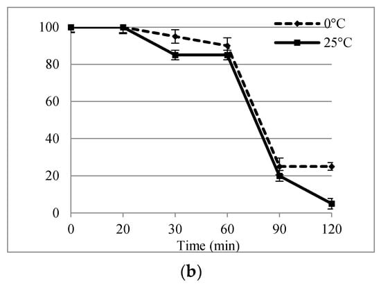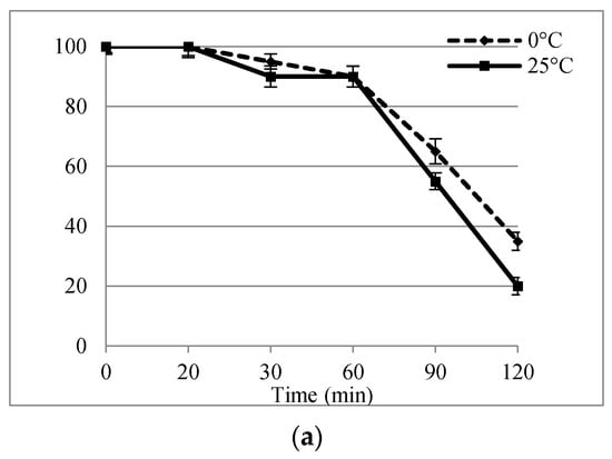 Effect of PVS2 treatment times on regrowth percentage (± SD) of S. rebaudiana apical shoot tips (a) and axillary shoot tips (b) at 0 °C and 25 °C, after 28 days of culture.
