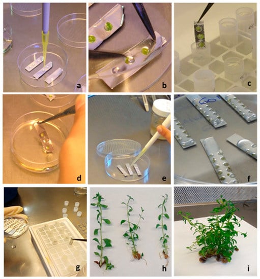 The DV procedure [19] is a method obtained by combining the vitrification procedure with the droplet-freezing technique developed by Kartha et al. [39] in which explants are placed in minuscule droplets of vitrification solution on aluminium foil strips, whereas the V cryo-plate procedure [20,40] combines the encapsulation and droplet-vitrification techniques, in which explants are placed on an aluminium cryo-plate and embedded in a thin layer of calcium alginate gel.