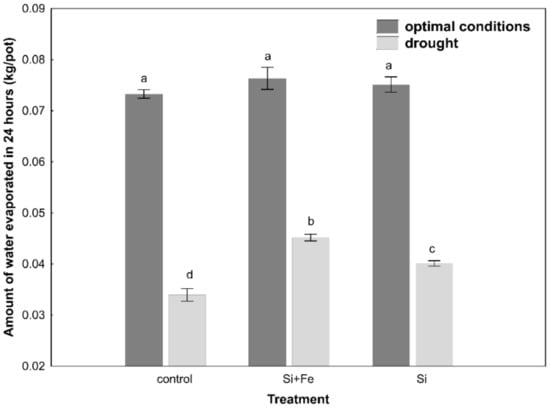 Amount of water evaporated in 24 h. Measurements were performed on pots with oilseed rape plants every day for 10 days during growth under optimal conditions or drought (Experiment 2). Prior to the 10 days, the plants grew for 44 days under optimal conditions and were watered three times with water (control), silicon and iron (Si + Fe), or only silicon (Si). The means (n = 15) ± SD (standard deviation) marked with the same letter do not differ significantly (Fisher’s multiple range test, p < 0.05).