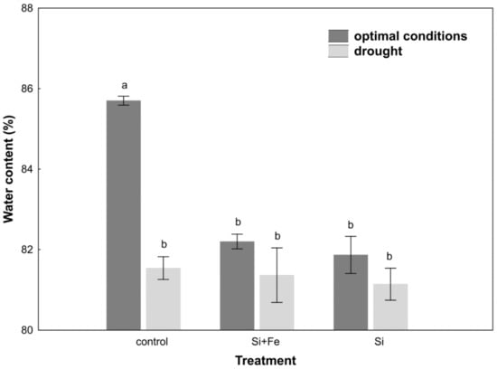 The water content measurements performed for oilseed rape plants growing under optimal and drought conditions showed that silicon (Si) and silicon with iron (Si + Fe) significantly reduced leaf water content of plants growing under optimal conditions compared to control plants (Figure 2).