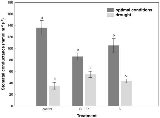 Stomatal conductance in leaves of oilseed rape. Plants grew first for 44 days under optimal conditions and were watered three times with water (control), silicon and iron (Si + Fe), or only silicon (Si), and afterwards for 10 days under optimal conditions or drought, after which stomatal conductance measurements were performed (Experiment 2). The means (n = 9) ± SD marked with the same letter do not differ significantly (Duncan’s multiple range test, p < 0.05).