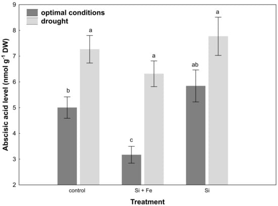 Under water-deficit conditions, a significant reduction in stomatal conductance was observed in all plants, but this change was not dependent on the presence of silicon. Drought stress increased abscisic acid (ABA) content in the leaves of control plants and plants watered with Si + Fe compared to those growing under optimal conditions (Figure 4).