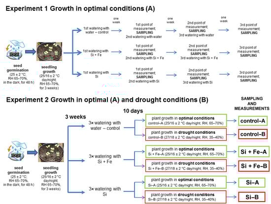 The scheme of two experiments conducted on oilseed rape plants. In both Experiments 1 and 2, plants grew for 44 days under optimal conditions and were watered three times with water (control), silicon and iron (Si + Fe), or silicon (Si). In Experiment 2, the plants then grew for 10 days under optimal conditions (A) or drought (B).