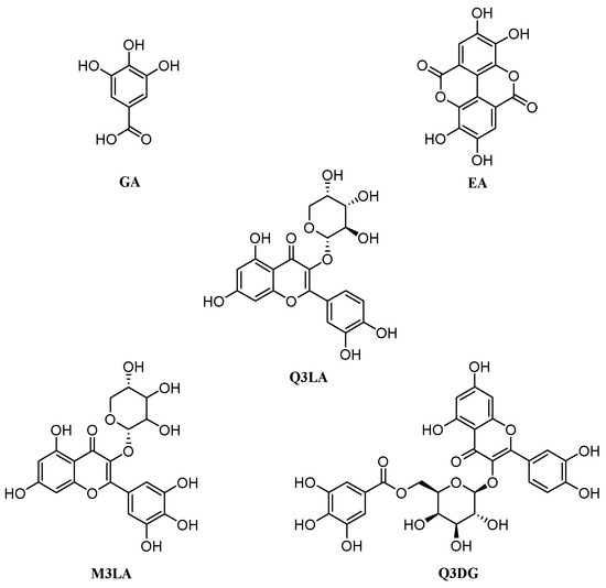 Figure 1. Chemical structures of the potential antidiabetic and antidepressant compounds screened from W. fruticosa leaves via computational analysis: GA (gallic acid), EA (ellagic acid), Q3LA (quercetin 3-O-α-L-arabinopyranoside), M3LA (myricetin 3-O-α-L-arabinopyranoside), and Q3DG (quercetin 3-O-(6″-galloyl)-β-D-galactopyranoside).