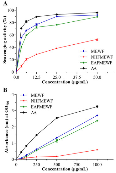 The antioxidant power of MEWF, NHFMEWF, and EAFMEWF is mentioned, in percentage form, in Figure 2A, concerning the ability to scavenge DPPH free radical. MEWF manifested the strongest radical scavenging activity (IC50 = 1.86 ± 0.16 µg/mL) compared to EAFMEWF and NHFMEWF, which is comparable with the positive control AA (IC50 = 0.22 ± 0.02 µg/mL). The IC50 values of EAFMEWF and NHFMEWF were assessed to be 4.30 ± 0.28 µg/mL and 47.03 ± 0.57 µg/mL, respectively (Table 3).