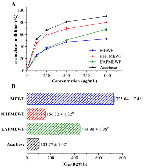 Figure 3. Anti-α-amylase activities of methanol leaves extract of W. fruticosa and its different fractions compared with the reference inhibitor acarbose. Values are shown as mean ± SEM (n = 3). (A) The percentage inhibition of α-amylase activity at four different concentrations (µg/mL). (B) IC50 values (µg/mL) for α-amylase activity. Values marked with different superscript letters (a, b, c, d) in different columns signify statistical differences at p < 0.01 (Tukey’s HSD test). MEWF, methanol extract of W. fruticosa leaves; NHFMEWF, n-hexane fraction of methanol extract of W. fruticosa leaves; EAFMEWF, ethyl acetate fraction of methanol extract of W. fruticosa leaves.