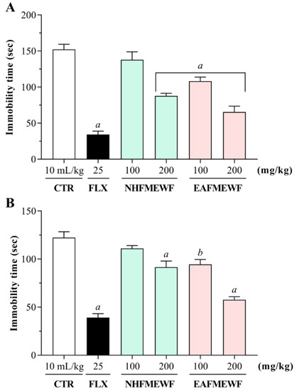 This test was conducted to screen the antidepressant activity of NHFMEWF and EAFMEWF in mice employing a previously described protocol [68]. The mice were individually placed in an open cylindrical glass compartment (10 × 25 × 19 cm3) containing freshwater (25 ± 1 °C) and their mobility was observed for thirty minutes after administration of doses, as mentioned in Section 2.7.3. Then, each mouse was monitored for a period of 6 min, the first 2 min were referred to as the initial adjustment time and the following 4 min were recorded as the period of immobility. The mouse was considered immobile while it remained floating motionlessly or treaded on the water just enough to keep its nose above the water surface and the percent inhibition of immobility was calculated by the following Equation (4):