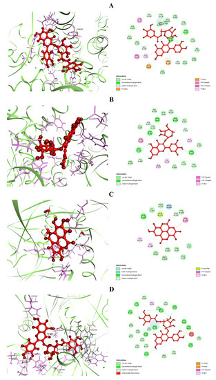 Molecular interactions between W. fruticosa leaves phytoconstituents and active site of the target proteins was explored through in silico molecular docking approach on Schrödinger Maestro (Maestro, version 11.8, Schrödinger, LLC, New York, NY, USA, 2018) and the resulting ligand–receptor complexes were visualized on BIOVIA Discovery Studio Visualizer v20.0 (BIOVIA, San Diego, CA, USA).
