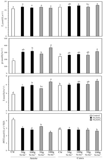 The cultivar Ceres showed a similar pattern of changes to that of Ariete as regards the leaf gas exchanges. After two foliar applications, there was no negative impact on Pn of any of the Se-treatments. In fact, Pn was significantly increased by the 50 g Se.ha−1 of Na2SeO4 treatment, and, especially with the maximum doses of both selenite and selenite compounds, always as compared to the control (Figure 1). Plants treated with the highest selenite or selenate concentrations showed a tendency to display higher gs and E values, although significantly only for Na2SeO3 cultivar. Still, no significant impacts were found for iWUE in Ceres (Figure 1).