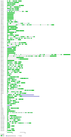 Using ATTs of Arabidopsis thaliana, O. sativa, and S. tuberosum as queries in BLAST search at SGN with ‘amino acid transporter’ and ‘amino acid permease’ as keywords, we identified 88 members of SlAATs. All the retrieved protein sequences of SlAATs were subjected to InterProScan (http://www.ebi.ac.uk/Tools/InterProScan/ (accessed on 31 January 2021)), and all the candidate proteins were found to contain AAT domain(s). Information about locus identity number of SlAATs assigned by SGN (Solanaceae Genomics Network, http://solgenomics.net/SOL (accessed on 31 January 2021)), the given nomenclature of S. lycopersicum AATs, number of intron(s) in the SlAAT genes, length of the ORF for SlAATs, protein characterization of SlAATs (amino acid length, MW, pI), and genomic location are presented in Table 1. The intron number ranged from 1 to 13 and the length of the ORF for SlAATs ranged from 267 to 3376 bp. It was observed that each subfamily member shared a nearly similar gene structure and intron numbers. For example, members of ProT subfamily contained six introns and an ORF length of 1473–1828 bps. The intron-exon regions in each genomic sequence of SlAAT are illustrated in Figure 1.