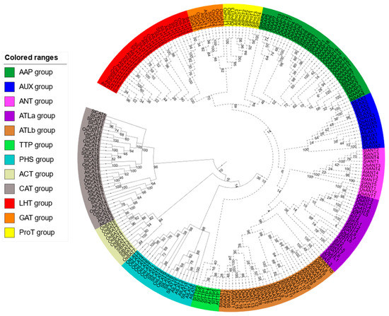 AATs are divided into two families; the first is amino acid/auxin permease (AAAP), which is in turn sub-grouped into eight subfamilies, including amino acid permease (AAP), lysine/histidine transporter (LHT), γ-aminobutyric acid (GABA) transporter (GAT), proline transporter (ProT), like-auxin influx carriers (LAX), aromatic and neutral amino acid transporter (ANT), vesicular aminergic-associated transporter (VAAT), and amino acid transporter-like proteins (ATL) [8]. The second family comprises of amino acid-polyamine-choline (APC) transporters, which in turn is sub-grouped into four subfamilies, including amino acid/choline transporters (ACT), tyrosine-specific transporter (TTP), cationic amino acid transporter (CAT), and polyamine H+ co-transporters (PHS) [9]. In addition, a new subfamily has been added to the AAT superfamily called Usually Multiple Amino Acids Move In and Out Transporters (UMAMIT) [10].