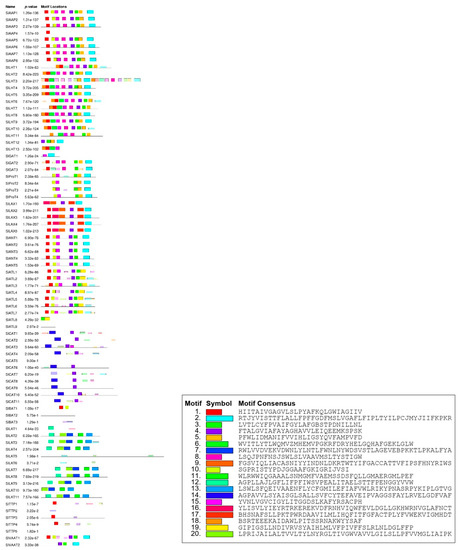 The motifs of SlAAT proteins were identified using the MEME tool (http://meme-suite.org/tools/meme (accessed on 31 January 2021)) with default settings, except that the maximum number of motifs was defined as 20.