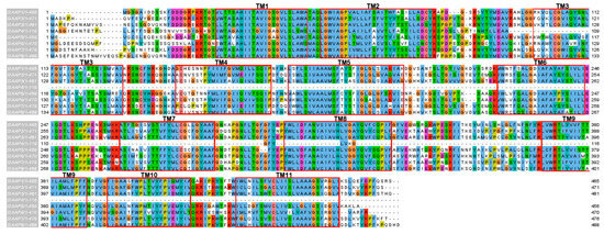 Motif analysis using MEME showed that each subfamily has a similar motif and nearly the same their number (Figure 4). For example, all members of the AAP subfamily were found to have the same motifs. In addition, some motifs are more common in one family than the other. For example, motif 1, 2, and 5 are likely to be more common in the AAAP family than the APC family. On the other hand, some motifs were specific to one subfamily; for example, motif 17 was specific to the LAX subfamily and motif 19 was specific to the ATL subfamily. Analysis of the transmembrane region conservation, revealed that most of the transmembrane regions were highly conserved. The alignment of AAP amino acid sequences and the transmembrane conserved region are illustrated as an example in Figure 5.