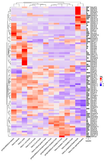 The RNA-Seq data from various tissues during vegetative and reproductive developmental stages of the tomato cultivar S. lycopersicon ‘Heinz’ and the wild relative S. pimpinellifolium was used to study the expression of SlATT genes (Figure 6). According to the column dendrogram, it was observed that there is a similar expression pattern between the leaves of both pimpinellifolium and S. lycopersicon ‘Heinz, S. lycopersicon ‘Heinz 1 cm fruit, S. lycopersicon ‘Heinz 2 cm fruit, S. lycopersicon ‘Heinz 3 cm fruit, and S lycopersicon ‘Heinz mature green fruit, S. pimpinellifolium immature green fruit, S. pimpinellifolium breaker fruit, S. lycopersicon ‘Heinz breaker fruit, and S. lycopersicon ‘Heinz breaker+ 10 fruit, S. lycopersicon ‘Heinz unopened flower buds, and S. lycopersicon ‘Heinz fully opened flowers. The expression of SlLHT3, SlANT5, SlLHT5, SlVAAT7, and SlCAT2 was detected to be high only in S. lycopersicon ‘Heinz unopened flower buds and extremely low in other examined parts of S. pimpinellifolium and S. lycopersicon ‘Heinz tomato plants. In addition, six genes, including SlAAP8, SlLHT4, SlLHT12, SlLHT13, SlAAP5, and SlAAP3 showed high expression levels in S. lycopersicon ‘Heinz unopened flower buds and fully opened flowers compared to other organs of both S. pimpinellifolium and S. lycopersicon ‘Heinz tomato plants.